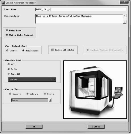 (2)新建一個后處理。在新建后置處理“Creat New Post Processor”對話 框 中 ,Post Name 為 FANUC_ 0i _D,輸出單位“Post Output Unit”設置為米制,機床類型選擇 Lathe(車床),機床控制系統(tǒng)從Library中選擇FANUC,如圖2所示,控制系統(tǒng)的選擇非常重要,一定要正確選擇所用數(shù)控系統(tǒng)。
